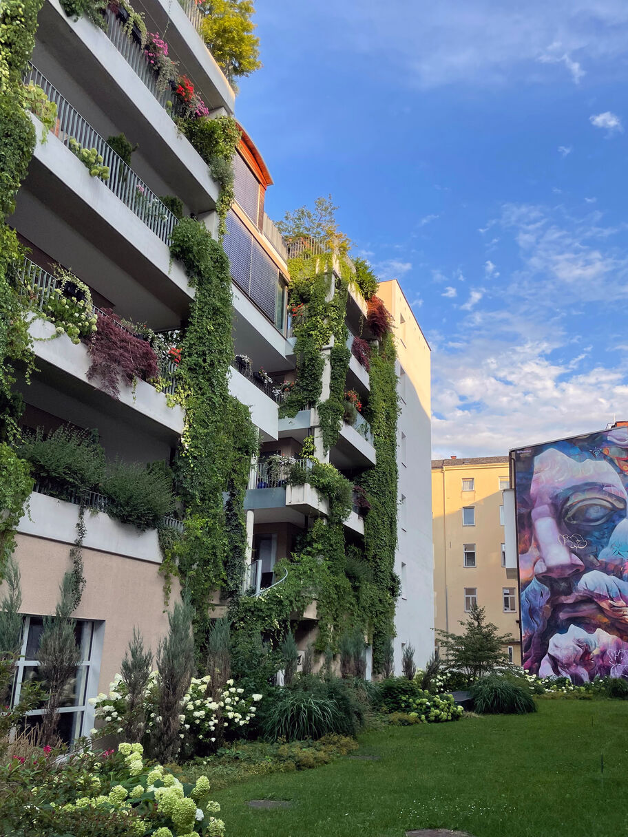Die Pflanztröge sind bodenbündig mit den Terrassen ausgeführt, die Bewässerung über gesammeltes Regenwasser erfolgt automatisiert.