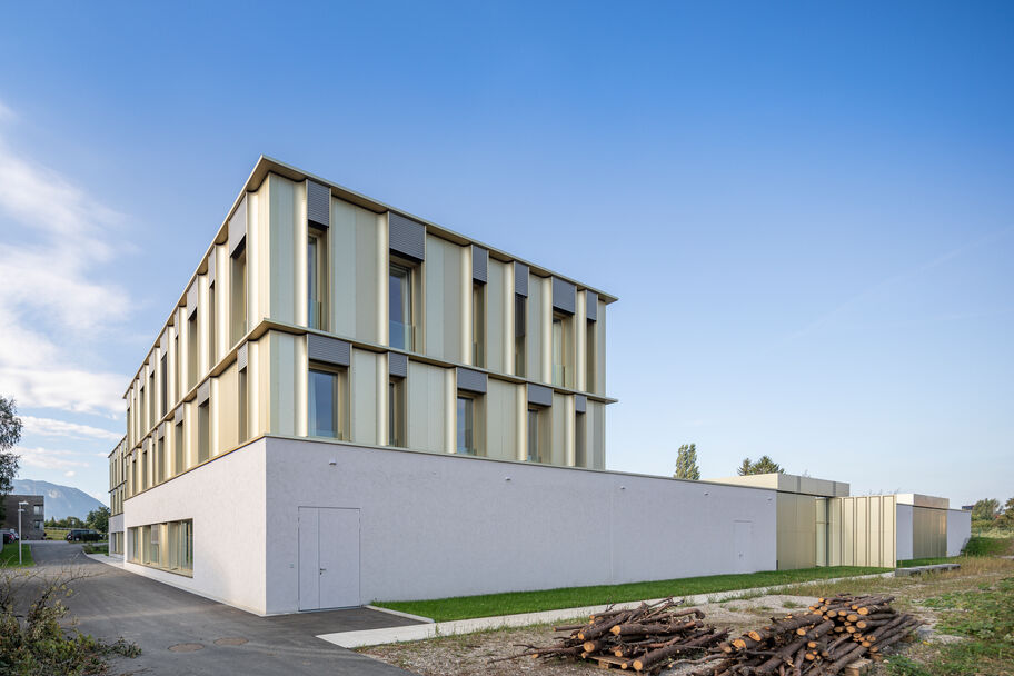 Die Ruhe und Gelassenheit des Gebäudesockels, einer umlaufenden Mauer mit hellem Stukturputz, wird kontrastiert durch die Materialität des Kopfbauteils und der Tore im Wohnbereich in weißgoldenem Eloxal-Aluminium. Die mehrfach gegliederte Fassade des Kopfbauteils (horizontale Hauptlinien, vertikale Sublinien, viertelgerundete Laibungen, Sonnenschutzjalousien) erzeugen speziell im Licht/Schattenspiel Oberflächentiefe.