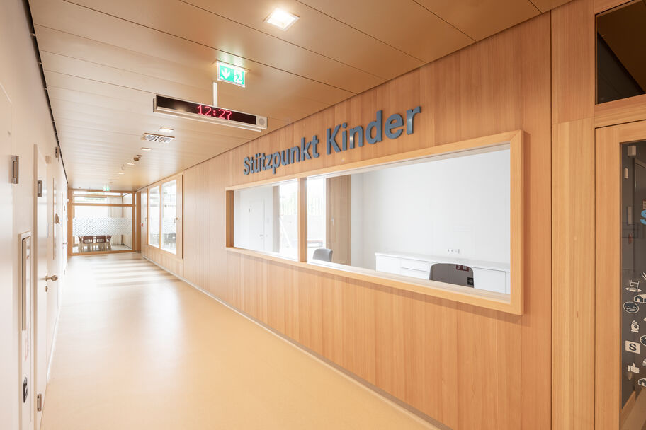 Im Inneren dominieren Lärchenholz (Wände, Türen, Möbel), erdfarbene Lehmputzwände, speziell geprägte Aluminiumdecken und durchaus kräftig inszenierte Farben das Erscheinungsbild der Wohnbereiche. Therapie- und Verwaltungsflächen des Kopfbaus werden bewußt etwas zurückhaltender, gewissermaßen klinischer (weiss, blau) gestaltet.