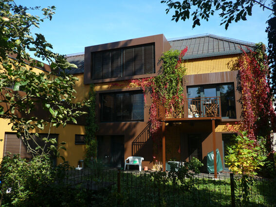 Zentraler Ausgangpunkt der architektonischen Überlegungen von Mathias Haas war, in der wildromantischen Innenhofsituation mit viel Grün ein nicht offensichtlich neu anmutendes Gebäude zu errichten, sondern das Haus so wirken zu lassen, als ob es schon immer dort gestanden hätte - beste „Vintage-Architektur“, wenn man so will. Die Fassade und das gesamte Dach sollen im Laufe der Zeit auch bewachsen werden. Als Rankgerüst bot sich ein vorgesetztes Gitter aus unbehandelten Baustahlgittermatten an - nicht nur ein sehr kostengünstiges Baumaterial, sondern durch die Rostpatina geradezu prädestiniert für „gebrauchte Architektur“.